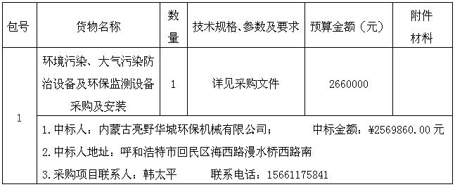 內(nèi)蒙古協(xié)眾工程項目管理有限責任公司受內(nèi)蒙古自治區(qū)第四醫(yī)院的委托,于2017年9月18日同時在內(nèi)蒙古自治區(qū)政府采購網(wǎng)(http://www.nmgp.gov.cn/)、內(nèi)蒙古招標投標網(wǎng)(http://www.nmgztb.com.cn/)、中國采購與招標網(wǎng)(http://www.chinabidding.com.cn/)、內(nèi)蒙古自治區(qū)第四醫(yī)院網(wǎng)(http://www.nmgsyy.com)、內(nèi)蒙古協(xié)眾工程項目管理有限責任公司網(wǎng)(http://m.biografiapr.com)上發(fā)布招標公告。于2017年10月11日就環(huán)境污染、大氣污染防治設備及環(huán)保監(jiān)測設備采購及安裝(UPCG-170705)采用公開方式進行招標?,F(xiàn)就本次采購的中標結果公告如下。