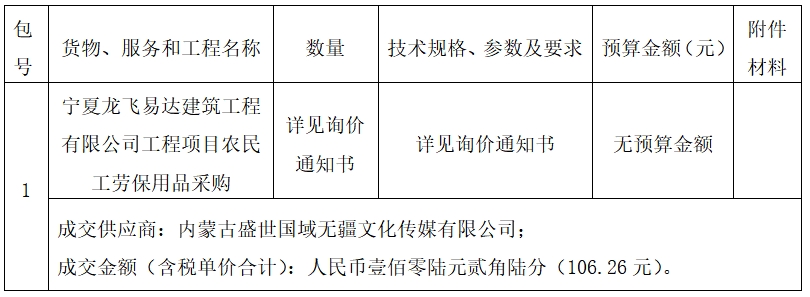 內(nèi)蒙古協(xié)眾工程項(xiàng)目管理有限責(zé)任公司受寧夏龍飛易達(dá)建筑工程有限公司的委托,于2024年12月2日在內(nèi)蒙古協(xié)眾工程項(xiàng)目管理有限責(zé)任公司網(wǎng)(http://m.biografiapr.com)上發(fā)布詢價(jià)公告。于2023年12月6日就寧夏龍飛易達(dá)建筑工程有限公司工程項(xiàng)目農(nóng)民工勞保用品采購(gòu)(詢價(jià)通知書編號(hào):UPZBCG-241211)采用詢價(jià)方式進(jìn)行采購(gòu)。現(xiàn)就本次采購(gòu)的成交結(jié)果公告如下。