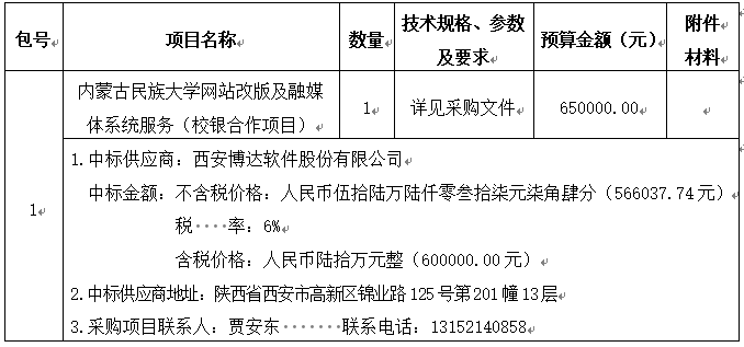 內(nèi)蒙古協(xié)眾工程項目管理有限責任公司受內(nèi)蒙古民族大學(xué)的委托,于2025年08月28日在中國招標投標公共服務(wù)平臺(http://www.cebpubservice.com/)、內(nèi)蒙古招標投標公共服務(wù)平臺(http://nmgztb.com.cn//)、內(nèi)蒙古協(xié)眾工程項目管理有限責任公司網(wǎng)(http://m.biografiapr.com)上發(fā)布招標公告。于2025年09月18日就內(nèi)蒙古民族大學(xué)網(wǎng)站改版及融媒體系統(tǒng)服務(wù)(校銀合作項目)(采購文件編號:UPZBFW-250804)采用公開招標方式進行采購?,F(xiàn)就本次采購的中標結(jié)果公告如下: